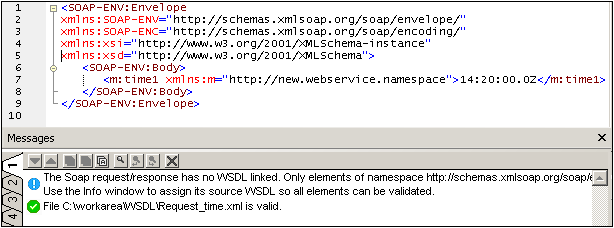To validate a SOAP message, open the SOAP message file (screenshot below) and press F8 (or the menu command XML | Validate). Since no WSDL file has been linked to the SOAP message file, the SOAP message is validated according to the rules for SOAP messages. The file is found to be valid if it is valid according to these rules (see the Messages Window in the screenshot below).
