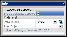 DB support for an XQuery document is enabled by checking the Enable Database Support check box in the Info window (screenshot below). Note that DB Support must be enabled for each XQuery document separately and each time an XQuery document is opened afresh.