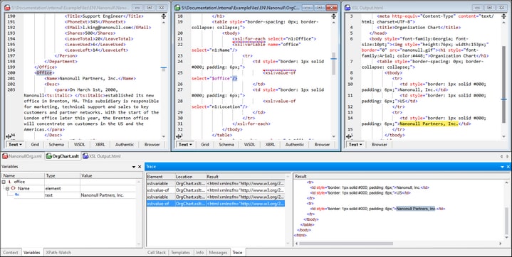The XSLT/XQuery Debugger enables you to debug XSLT stylesheets and XQuery documents. It presents simultaneous views of the XSLT/XQuery document, the source XML/JSON document, and the output document. You can go step-by-step through the XSLT/XQuery document to see what output is generated at each step. At each step, the corresponding positions in the source XML/JSON document, the XSLT/XQuery document, and the output document are highlighted, and debugging information is displayed in ancillary windows of the debugger.