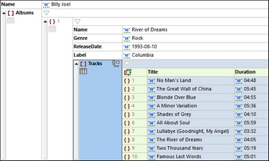 Objects and arrays that contain at least one object or array can be viewed either as a list (highlighted in screenshot at left) or as a table (highlighted in screenshot at right). To switch between these two views, click the table icon that is located below the object or array icon (see screenshot). In array tables, the array items are displayed as rows. For example, in the screenshot below right, the Tracks array is displayed as a table. This array consists of child objects, which are displayed as rows. Each object's properties (Title and Duration in the screenshots below) are shown as columns, with the names of common properties being displayed as the headers of columns. To switch rows and columns, click the icon in the top left cell of the table.
