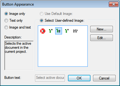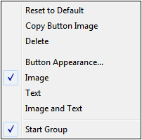 •Image, Text, Image and Text: Mutually exclusive options that determine whether the selected toolbar icon will be an icon only, text only, or both icon and text. You can select one of these options to make the change. Alternatively, you can make this change in the Button Appearance dialog.