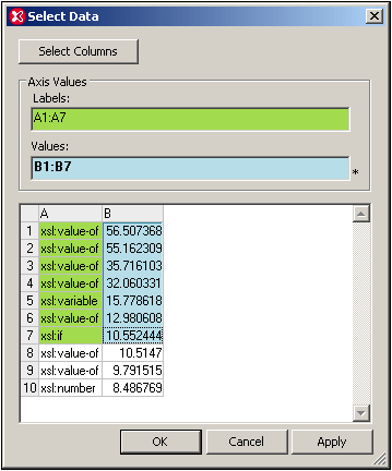 Clicking the Select Columns button enables you to change the data selection for the data table. See the Source XPath, X-Axis Selection, and Y-Axis Selection for information about how column selection works.