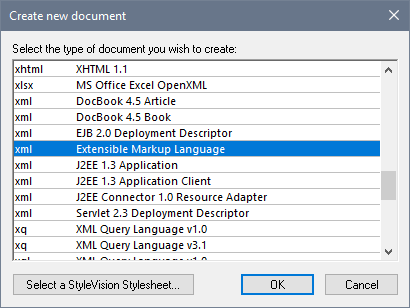 2.Select the Extensible Markup Language entry (or generic XML document entry) from the dialog, and confirm with OK. A prompt appears, asking if you want to base the XML document on a DTD or Schema.