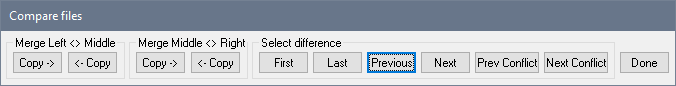 You can use the buttons in the Merge pane to copy the highlighted content from one pane to another. Use the appropriate Copy-direction button of a pane-pair. In order to enable merging, the following Compare options must be set: