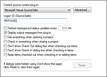 Any source control plug-ins compatible with the Microsoft Source Code Control Plug-in API are displayed in the Current source control plug-in drop-down list.