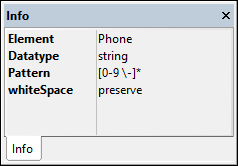 The Info Window (screenshot below) shows information about the element or attribute in which the cursor is currently positioned. Information is available in the Info Window in Text View, Grid View, and Authentic View.
