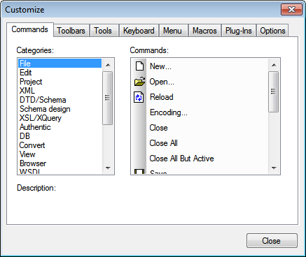 The Commands tab allows you customize your menus and toolbars. You can add application commands to menus and toolbars according to your preference. Note, however, that you cannot create new application commands or menus yourself.