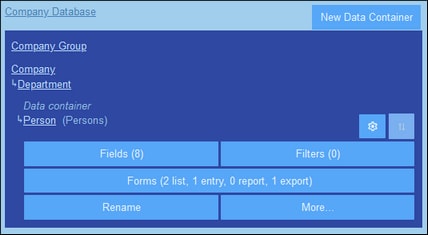 Cada contenedor tiene un conjunto de definiciones (más abajo puede ver las del contenedor Person). Las más importantes son: los campos del contenedor, los formularios diseñador para el contenedor y los filtros para restringir la selección de datos. Estas definiciones se describen en los apartados correspondientes: Contenedores, Campos, Filtros y Formularios.
