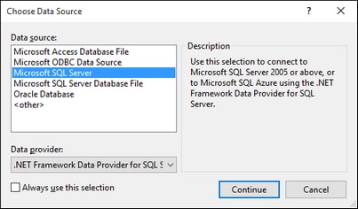 2.Seleccione un origen de datos de la lista (en este ejemplo, Microsoft SQL Server). El proveedor de datos se rellena automáticamente en función de la opción elegida.