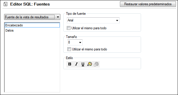 En la lista del panel izquierdo aparecen los diferentes elementos de las instrucciones SQL. En esta pestaña puede elegir el tipo, el estilo y el tamaño de la fuente de todo el texto que aparece en el Editor SQL. Recuerde que el tipo y el tamaño elegidos se aplican a todos los elementos, pero puede elegir un estilo diferente para cada elemento. Esto habilita la función de color de sintaxis. Para volver a la configuración predeterminada haga clic en el botón Restaurar valores predeterminados.