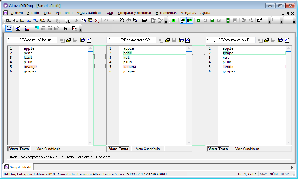 La comparación a tres bandas funciona igual con los archivos XML, pero recuerde que en el caso de comparar archivos XML también podrá ver las diferencias en la vista Cuadrícula, no solo en la vista Texto.