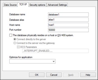 7.En la pestaña TCP/IP, introduzca el nombre de la base de datos, un nombre para el alias, el nombre del host y el número de puerto y, a continuación, haga clic en Aceptar.