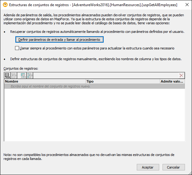 Llamar a un procedimiento almacenado en el momento de diseñar la asignación puede tener efectos secundarios (dependiendo de la implementación del procedimiento). Si no quiere ejecutar el procedimiento almacenado en el momento de diseñar la asignación, entonces no haga clic en Ejecutar, como se describe en los siguientes pasos. En vez de eso, defina el conjunto de registros esperado en el cuadro de diálogo "Estructuras de conjuntos de registros" añadiendo manualmente conjuntos de registros y sus columnas asociadas. Use los botones Agregar conjunto de registros y Agregar columna del cuadro de diálogo "Estructuras de conjuntos de registros".