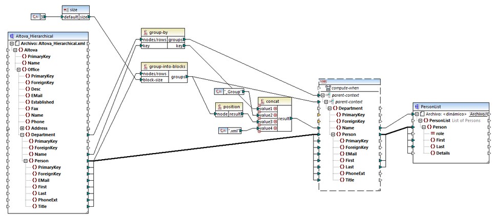 El diseño de asignación que aparece más abajo corresponde al archivo DividePersonsByDepartmentIntoGroups.mfd situado en la carpeta <Documentos>\Altova\MapForce2026\MapForceExamples\.