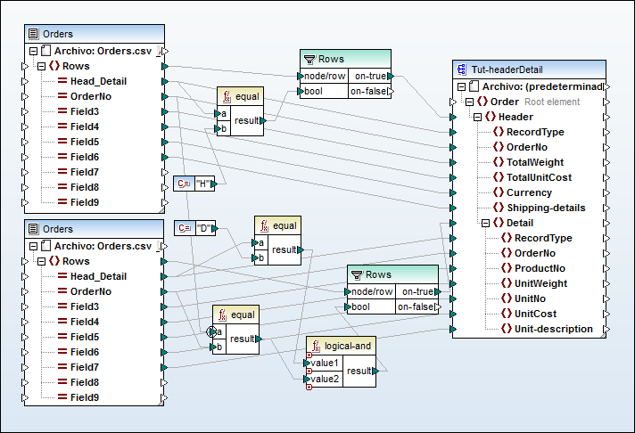 El segundo archivo Orders.csv aporta los registros detallados Detail (y todos los campos asignados) filtrando los registros Detail que coinciden con la clave OrderNo del registro Header. Esto se consigue de esta manera: