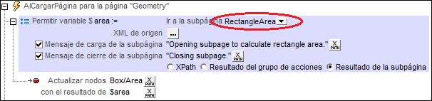 Si marca la opción Resultado de la subpágina (imagen siguiente), el valor de la variable será el resultado de una subpágina. Esto permite realizar un cálculo en otra página y, cuando se cierre la subpágina, existirá la opción de devolver un resultado. Este resultado es el "resultado de la subpágina" que se utilizará como valor de la variable definida en la acción Permitir. Por ejemplo, en el diseño de la imagen siguiente la acción Permitir define una variable llamada $area y establece que su valor es el resultado de la subpágina llamada RectangleArea (marcada con un círculo rojo).