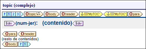Después se creó un marcador TDC (etiquetas amarillas de la imagen siguiente) dentro del elemento header descendiente de topic (pero fuera del elemento para). Este marcador TDC sirve de anclaje para cada elemento topic de nivel superior (de tipo capítulo).