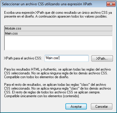 Si hace clic en el comando Seleccionar un archivo CSS mediante una expresión XPath, se abre un cuadro de diálogo donde puede escribir la expresión XPath (imagen siguiente). La expresión XPath debe dar como resultado el nombre de uno de los archivos CSS del diseño SPS, tal y como aparecen en el panel superior del cuadro de diálogo. Si escribe el nombre de archivo como cadena de texto, recuerde que debe ir entre comillas simples (como todas las cadenas de texto de las expresiones XPath).