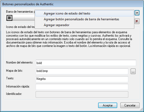 Para añadir un icono de estado del texto en la barra de herramientas Authentic, haga clic en el botón Agregar situado en la esquina superior derecha del diálogo "Botones personalizados de Authentic" (imagen siguiente) y después seleccione Agregar icono de estado del texto. Después escriba el nombre del elemento XML para el icono y busque una imagen para el botón o escriba un texto simplemente. Si quiere, también puede insertar información rápida, que aparecerá cuando el usuario de la vista Authentic pase el puntero del ratón encima del icono. Haga clic en Aceptar para agregar el botón a la barra de herramientas.