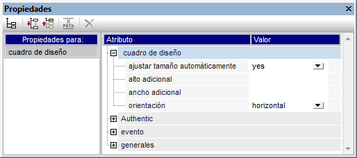 Las propiedades alto adicional y ancho adicional son las medidas que se obtienen al cambiar a mano el tamaño del cuadro de diseño (son medidas adicionales porque se suman a la dimensión óptima que se determina durante el ajuste automático del tamaño). Por tanto, puede cambiar el valor de estas propiedades para cambiar el tamaño del cuadro de diseño.
