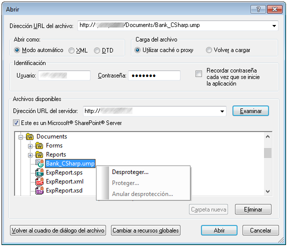 Para poder modificar el archivo en UModel debe hacer clic con el botón derecho en el archivo y seleccionar Desproteger en el menú contextual. Cuando un archivo se desprotege en el servidor Microsoft® SharePoint® y se guarda en UModel, los cambios se envían al servidor. Para volver a proteger el archivo en el servidor debe hacer clic con el botón derecho en el archivo y elegir Proteger en el menú contextual (también puede iniciar sesión en el servidor y realizar la misma operación desde el explorador). Para descartar los cambios realizados en el archivo desde que se desprotegió basta con hacer clic con el botón derecho en el archivo y elegir Deshacer desprotección en el menú contextual (la misma operación puede llevarse a cabo desde el explorador).
