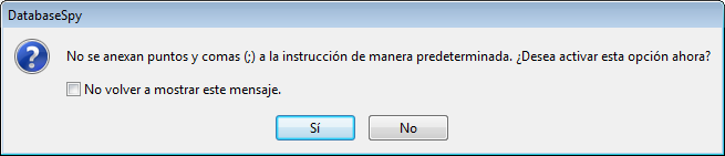 Si desactiva la casilla Anexar punto y coma al final de la instrucción y activa la casilla Mostrar advertencia cuando el editor imponga el uso de punto y coma y la generación SQL no lo haga, DatabaseSpy emitirá un mensaje cuando se genere una instrucción (véase Generar instrucciones SQL).