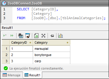 En la imagen anterior el nombre de la ventana Resultados es Result1. Puede que esto no sea demasiado informativo si trabaja con varias consultas en el mismo proyecto. Para poder manejar mejor los resultados puede ejecutar varias consultas en un mismo script y mostrar los resultados en distintas ventanas de resultados a las que puede dar distintos nombres. Por ejemplo, puede tener una consulta que seleccione datos de la tabla tblAnimalCategories y otra que selecciona datos de la tabla tblAnimalTypes. Puede agregar las dos al mismo script SQL y mostrar los dos conjuntos de resultados que devuelven por separado. Puede configurar cada una de las ventanas Resultados con un nombre diferente.