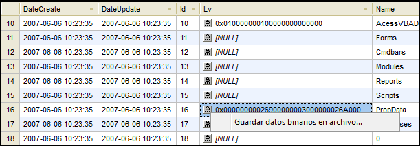 Nota: MS Access no admite la carga de archivos binarios en columnas binarias.