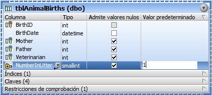 En este apartado del tutorial aprenderá a definir una restricción predeterminada en la tabla tblAnimalBirths que establece el número de partos predeterminado en 1 para todas las filas nuevas que se añadan en la vista de resultados.