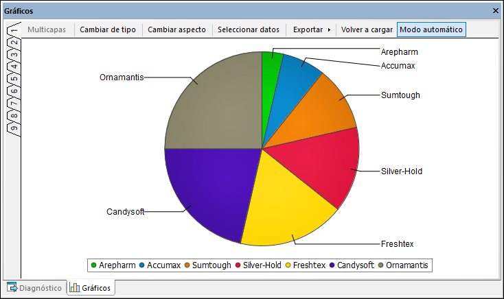 La ventana Gráficos sirve para ver de forma gráfica los datos seleccionados en la cuadrícula de resultados. La ventana está dividida en nueve pestañas (imagen siguiente) para que pueda producir varios gráficos a partir del mismo conjunto de resultados o de conjuntos diferentes.
