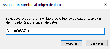 10.En el cuadro de diálogo "Asignar un nombre al origen de datos" introduzca un nombre para la conexión y haga clic en Aceptar. En este ejemplo el nombre de la conexión es "ConexiónBDZoo".