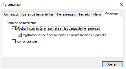 Mostrar información en pantalla en las barras de herramientas: al pasar el puntero del ratón sobre los botones de las barras de herramientas aparece información sobre la función del icono, así como su tecla de acceso rápido (si le asignó una y si marcó la casilla Mostrar teclas de acceso rápido).