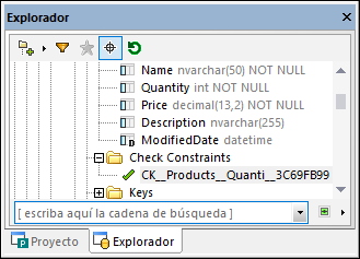 En el Explorador las restricciones de comprobación aparecen en la carpeta "Restricciones de comprobación" de una tabla, acompañadas por el icono dbs_ic_check_constraint.