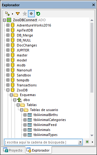 En la ventana Explorador aparecen todos los objetos de DB de los servidores a los que esté conectado. La estructura de las carpetas y los objetos de BD que se muestran en el Explorador pueden varias en función del tipo de base de datos.