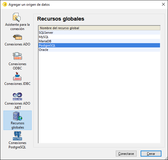 Desde el asistente para la conexión a una base de datos puede reutilizar cualquier conexión que se haya definido como recurso global y añadirla a su proyecto. Para ello haga clic en la pestaña Recursos globales, seleccione el recurso en cuestión y haga clic en Conectar.