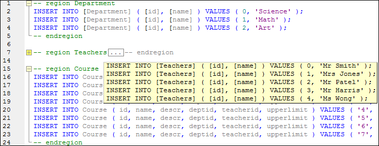 2.Haga clic en el botón Agregar región ic_insert-region de la barra de herramientas Script SQL o seleccione el comando de menú Editor SQL | Insertar región.