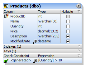 3.Asegúrese de que la restricción de comprobación está seleccionada en la ventana Explorador y edite la propiedad Expresión en la ventana Explorador. También puede editar la propiedad Descripción. En este ejemplo, que es específico para una BD SQL Server, la expresión garantiza que el valor de la columna sea siempre mayor que o igual a 0.