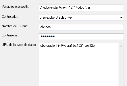 3.En el campo Variables classpath debe introducir la ruta de acceso del archivo .jar que ofrece conectividad con la base de datos. Si fuera necesario, también puede introducir una lista de rutas de archivo .jar separadas por caracteres de punto y coma. En este ejemplo, el archivo .jar está ubicado en esta ruta de acceso: C:\jdbc\instantclient_12_1\ojdbc7.jar. Tenga en cuenta que este campo puede dejarse en blanco si añadió la ruta de acceso de los archivos .jar a la variable de entorno CLASSPATH del sistema operativo (véase Configurar la variable CLASSPATH).
