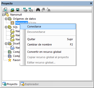 El proyecto contiene una conexión a una base de datos SQLite que está inactiva por defecto. Para conectarse al origen de datos haga clic con el botón derecho en la ventana Proyecto y seleccione Conectarse en el menú contextual.