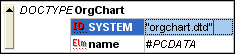 Nota: la fila para el ExternalID se puede añadir como secundario cuando está seleccionado el elemento DOCTYPE. También se puede insertar o anexar cuando está seleccionado uno de los componentes secundarios de DOCTYPE, por ejemplo, la declaración de elemento name del ejemplo anterior.