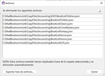 Si todos los duplicados de un archivo se encuentran en el directorio seleccionado, el cuadro de diálogo Eliminar archivos duplicados también le informará sobre los archivos que solo se pueden eliminar manualmente. Haga clic en Mostrar para ver una lista con estos archivos. También puede copiar la lista o guardarla en un archivo de texto con el botón Exportar lista de archivos.