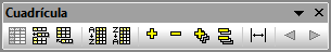 Los iconos de la barra de herramientas Edición Cuadrícula (imagen siguiente) sirven para editar contenidos en la vista Cuadrícula. Para más información sobre estos comandos consulte el menú vista Cuadrícula. Recuerde que esta barra de herramienta está deshabilitada por defecto. Para habilitarla, marque la casilla Edición Cuadrículaen la pestaña Barras de herramientas del cuadro de diálogo que se abre con el comando Herramientas | Personalizar.