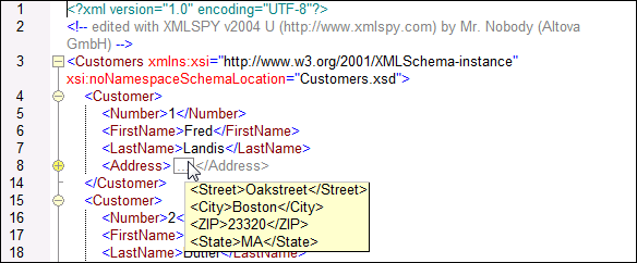 El término plegamiento de código hace referencia a la posibilidad de expandir y contraer nodos (ver imagen siguiente) y esta función está disponible en el margen de plegamiento de código. El margen se puede habilitar/deshabilitar en el cuadro de diálogo "Configurar la vista Texto" (ver imagen anterior). Para expandir o contraer partes del texto, haga clic en los nodos + y - situados en el margen izquierdo de la ventana. Las partes del texto que estén contraídas aparecen marcadas con puntos suspensivos. Para obtener una vista previa del texto que está contraído sin expandirlo, pase el puntero por encima de los puntos suspensivos. Esto abre información rápida con el texto (imagen siguiente). Tenga en cuenta que, si el texto que aparece en la información rápida es demasiado largo, al final aparecen otra vez puntos suspensivos.