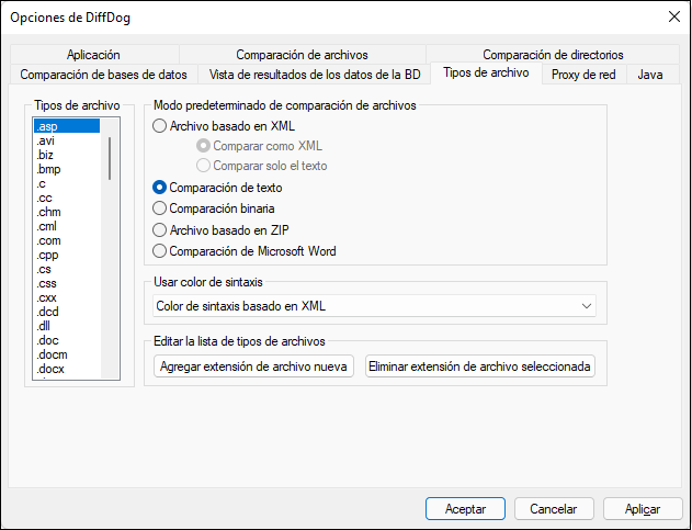 En la pestaña Tipos de archivo, puede establecer el modo de comparación predeterminado para cada tipo de archivo. Los tipos de archivo se reconocen por su extensión (.asp, .biz, etc.) y el modo de comparación puede ser la comparación XML, de texto, binaria o basada en ZIP.