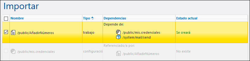 Si más adelante intenta importar el archivo .zip a un entorno de FlowForce Server en el que exista el objeto /public/Jobs/my.credentials, podrá hacer la importación, ya que ahora la dependencia puede resolverse.
