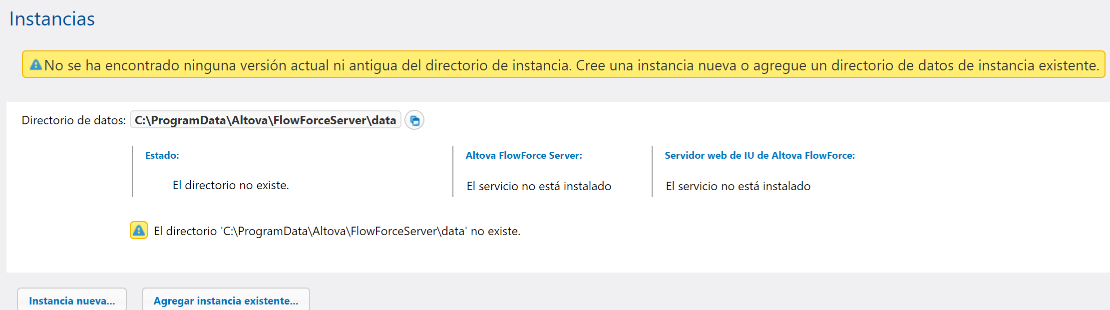 2.Seleccione un directorio de datos de instancia existente que contenga flowforce.db y otros archivos de instancia de FlowForce.