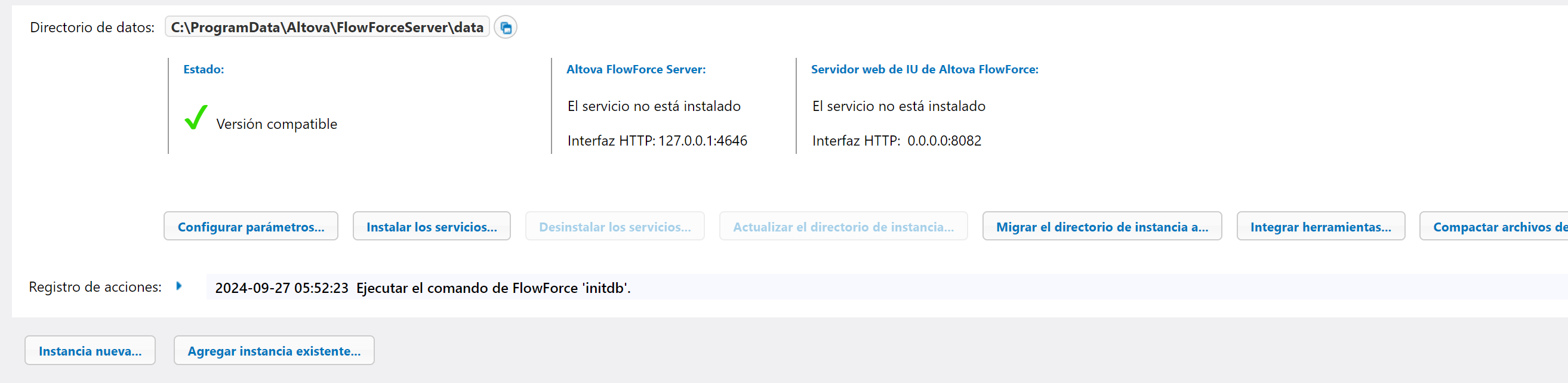 En cuanto haya inicializado la instancia, aparecerán el estado actual, las actividades registradas y varias opciones de configuración (imagen siguiente). El estado informa sobre si la versión del servidor es compatible. También se indicará si los servicios FlowForce Server y FlowForce Web Server están instalados y en funcionamiento.
