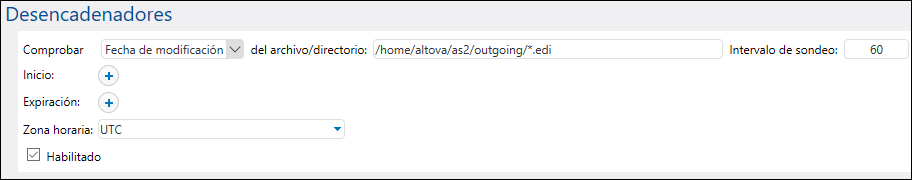 Cuando añada el desencadenador se añadirá automáticamente al trabajo un parámetro llamado triggerfile. Este parámetro representa el nombre del archivo que desencadenará automáticamente este trabajo cada vez que copie un archivo a /home/altova/as2/outgoing. Para más información, consulte Desencadenadores de sistema de archivos.