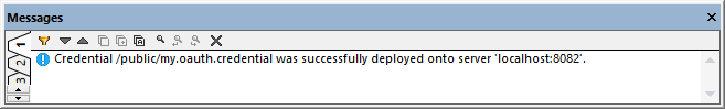 3.Rellene los detalles correspondientes de FlowForce Server y haga clic en Aceptar. Si la credencial se implementó correctamente podrá verlo en la ventana Mensajes: