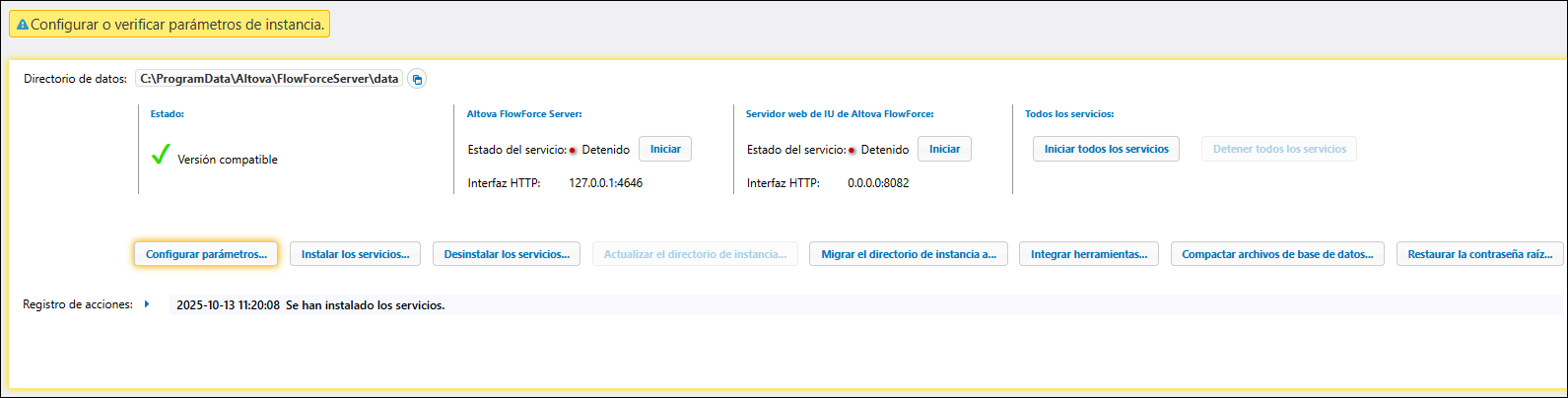 Para saber más sobre la creación, configuración e instalación de una instancia de servidor, consulte Procedimientos de configuración más abajo. Es importante destacar que antes de compactar los archivos de la base de datos, de actualizar la base de datos, de integrar herramientas y de migrar los datos de las instancias, debe detener los servicios FlowForce Server y FlowForce Web Server.